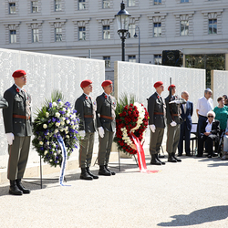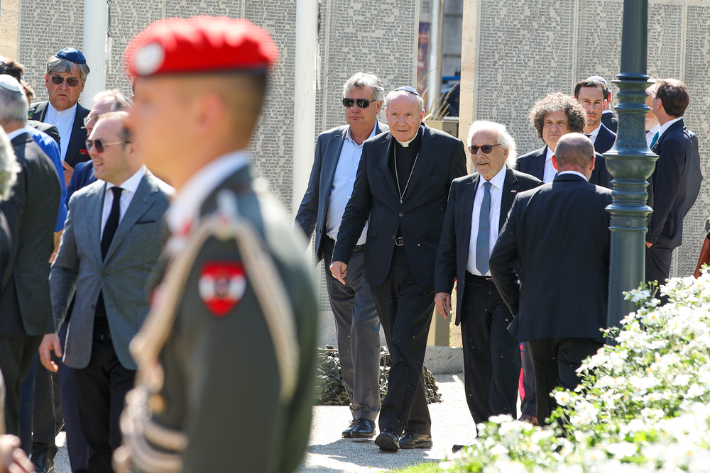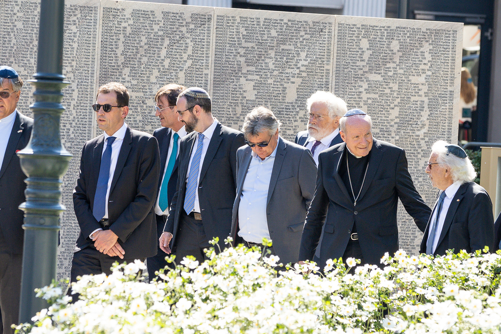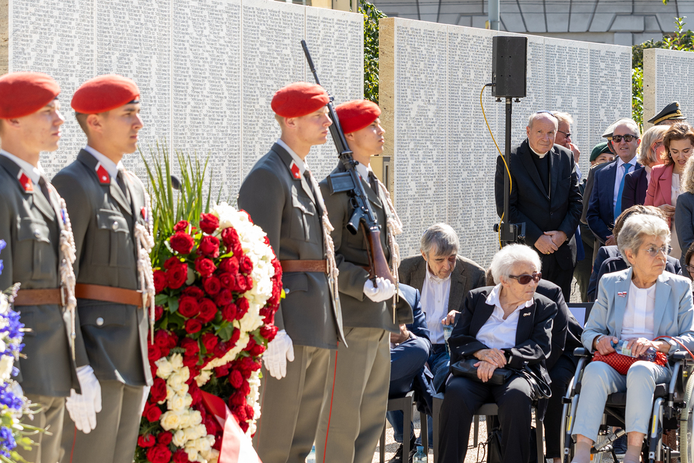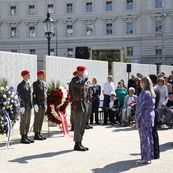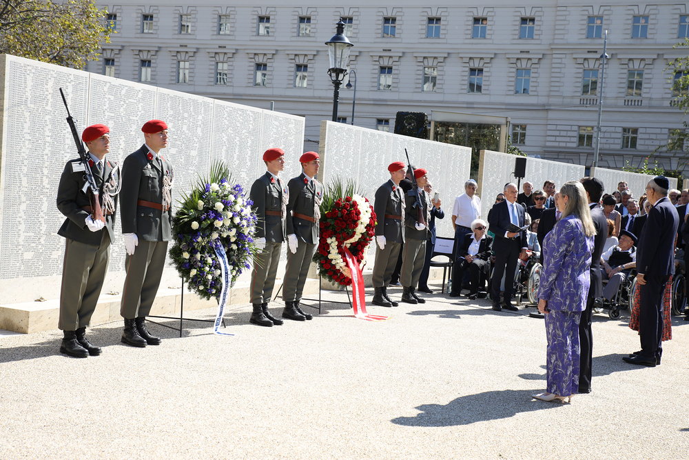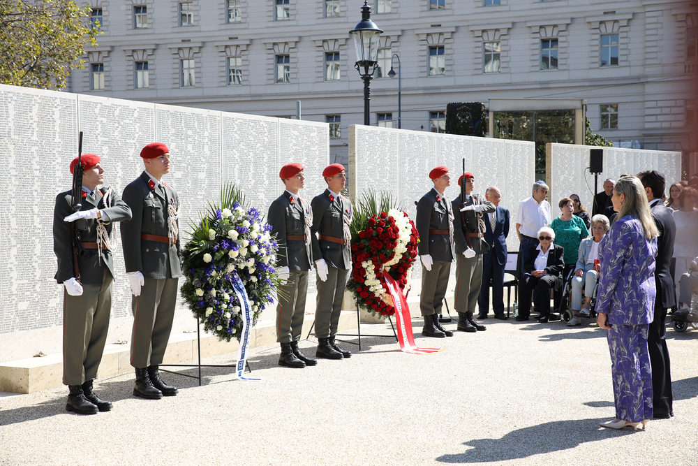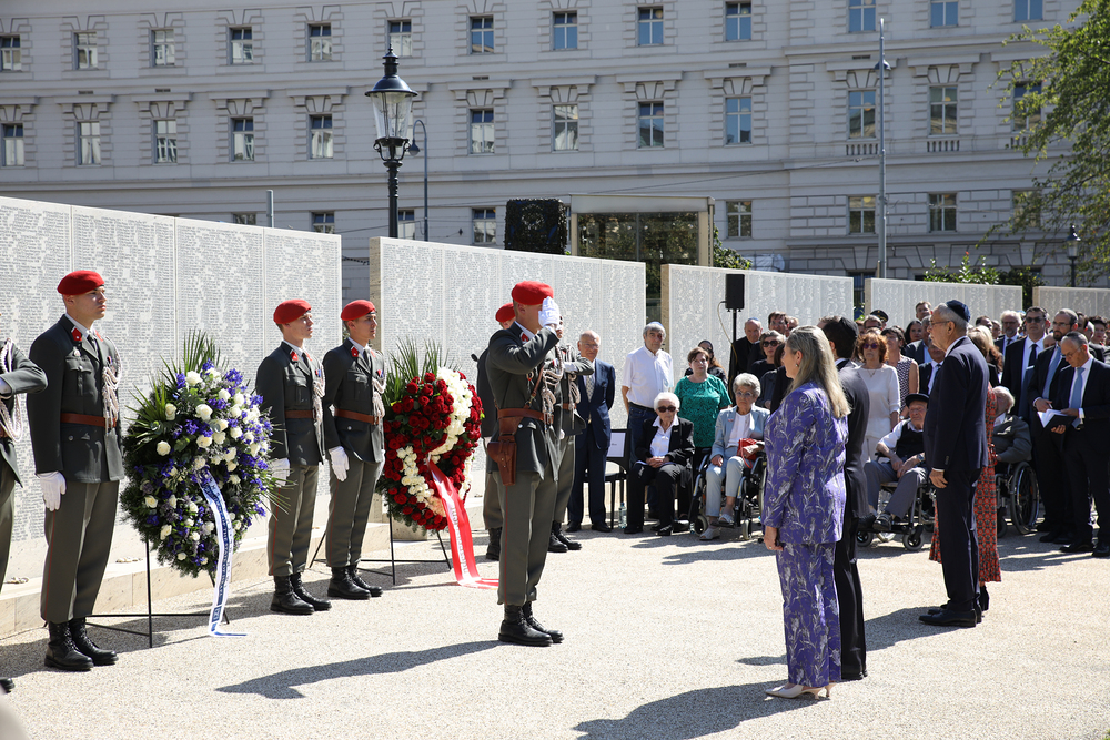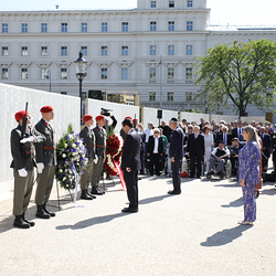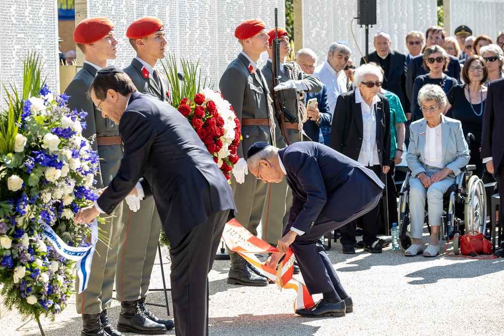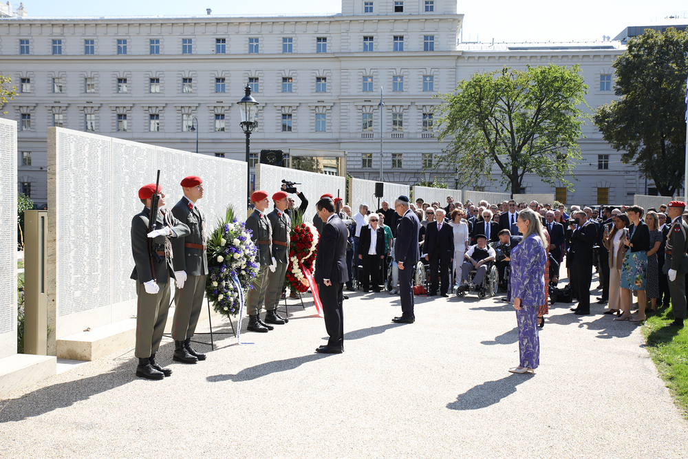 Kranzniederlegung an Gedenkstätte für Shoah-Opfer durch Präsident Yitzhak (Isaac) Herzog und Bundespräsident Alexander Van der Bellen mit Kardinal Schönborn.