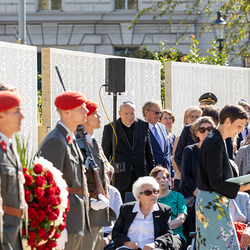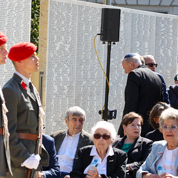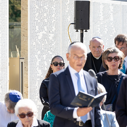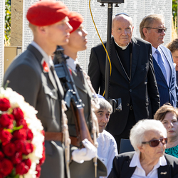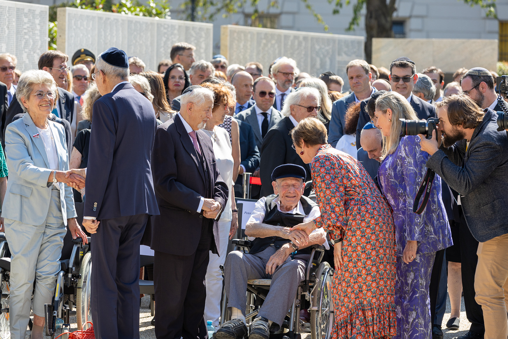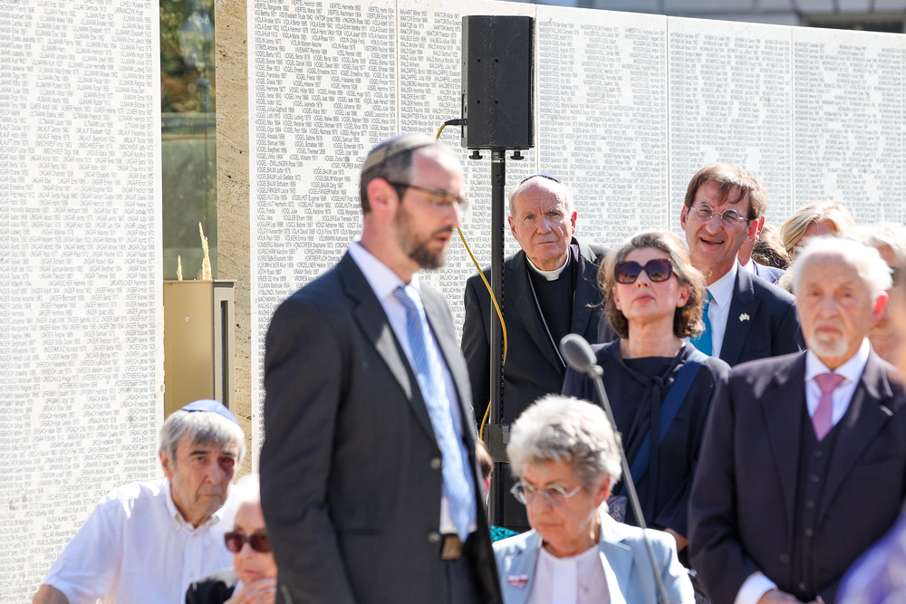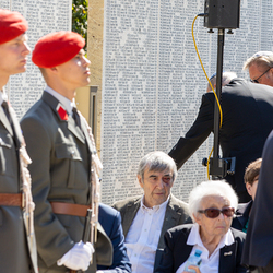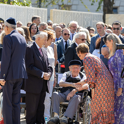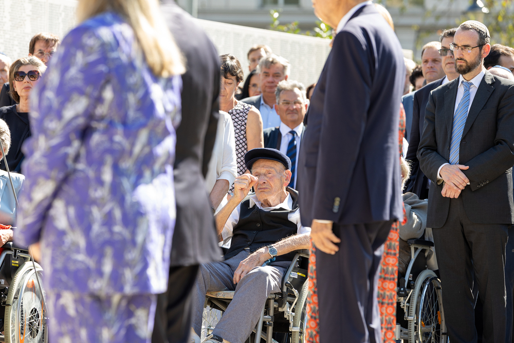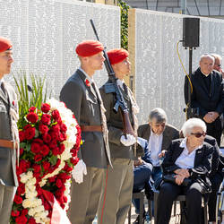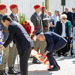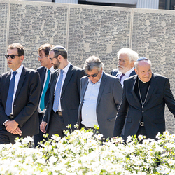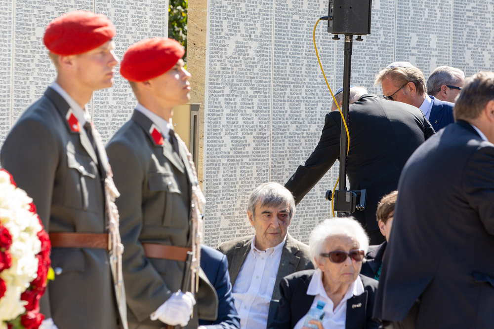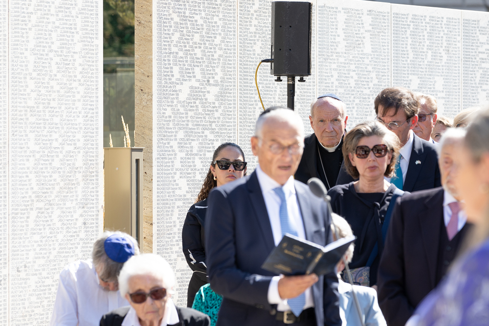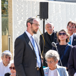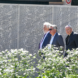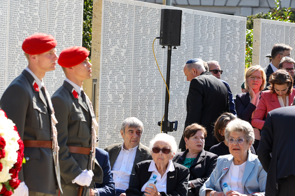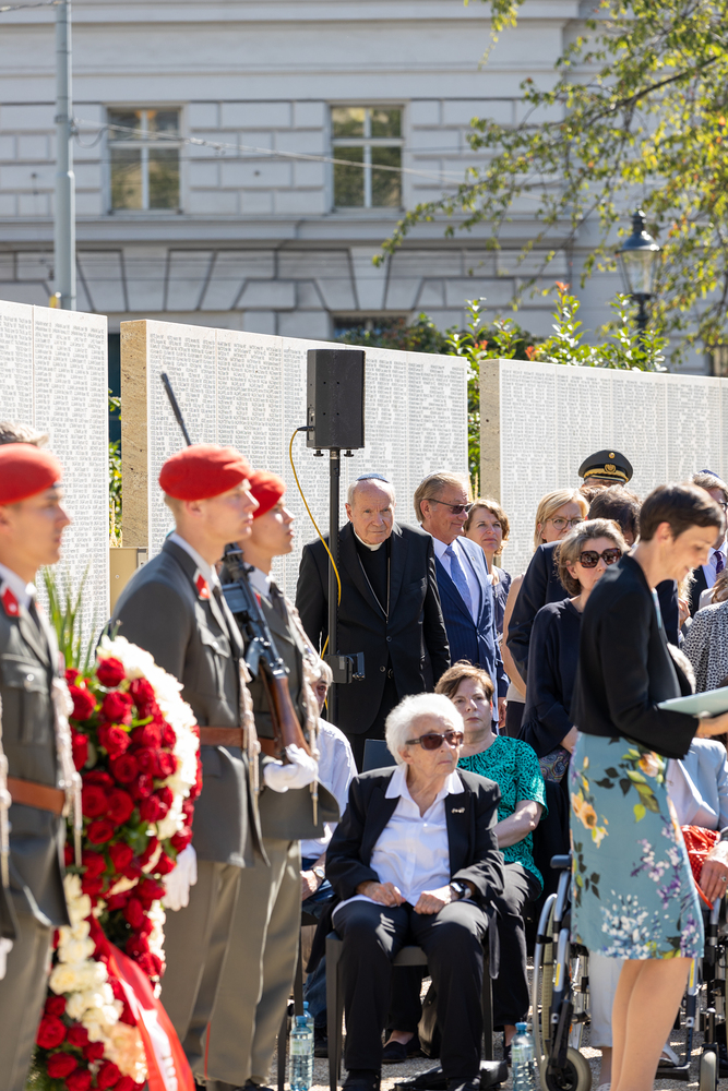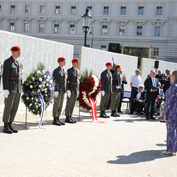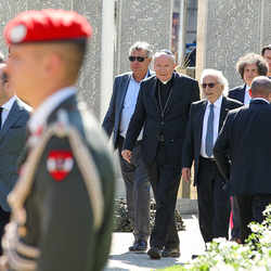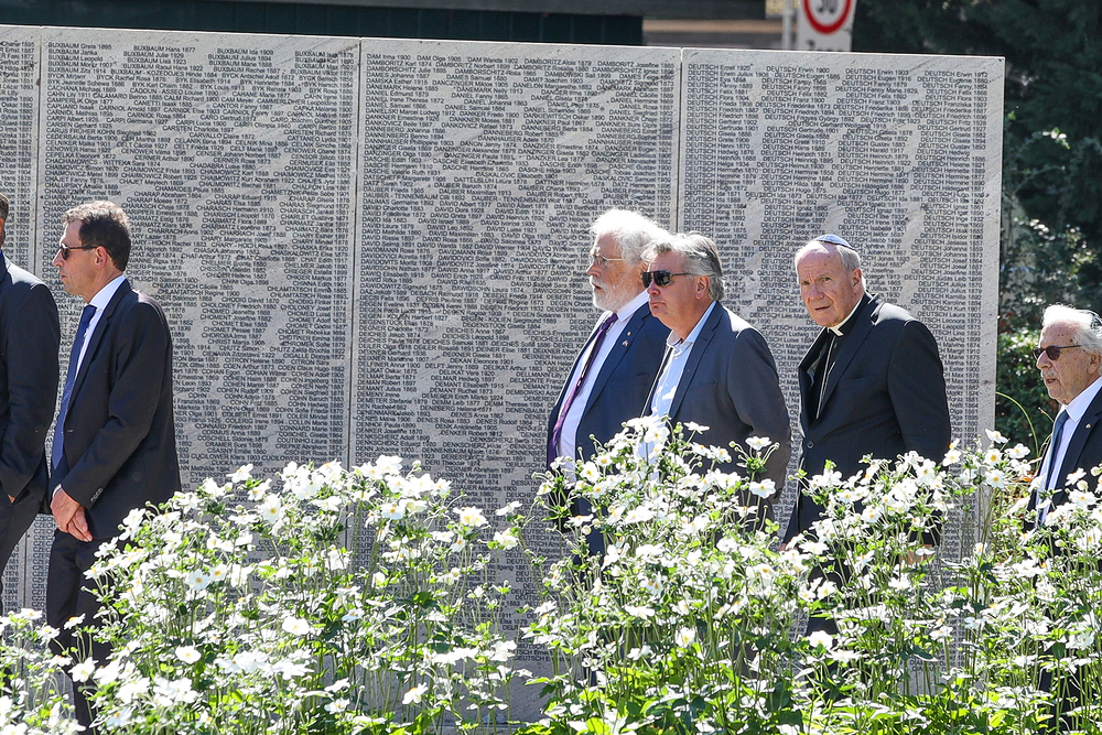 Kranzniederlegung an Gedenkstätte für Shoah-Opfer durch Präsident Yitzhak (Isaac) Herzog und Bundespräsident Alexander Van der Bellen mit Kardinal Schönborn.